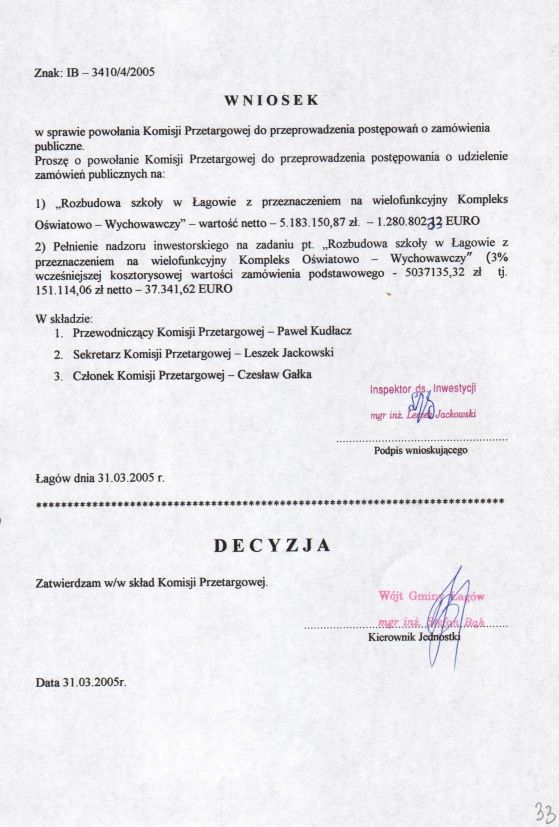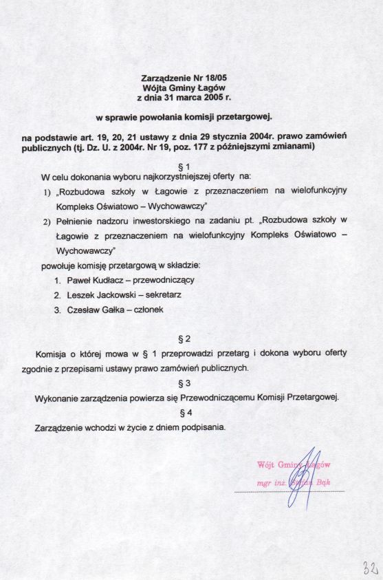 | Zarządzenie nr 18/05 Wójta Gminy Łagów z dn. 31 marca 2005 r. w sprawie powołania komisji przetargowej. | 2008-10-17 |