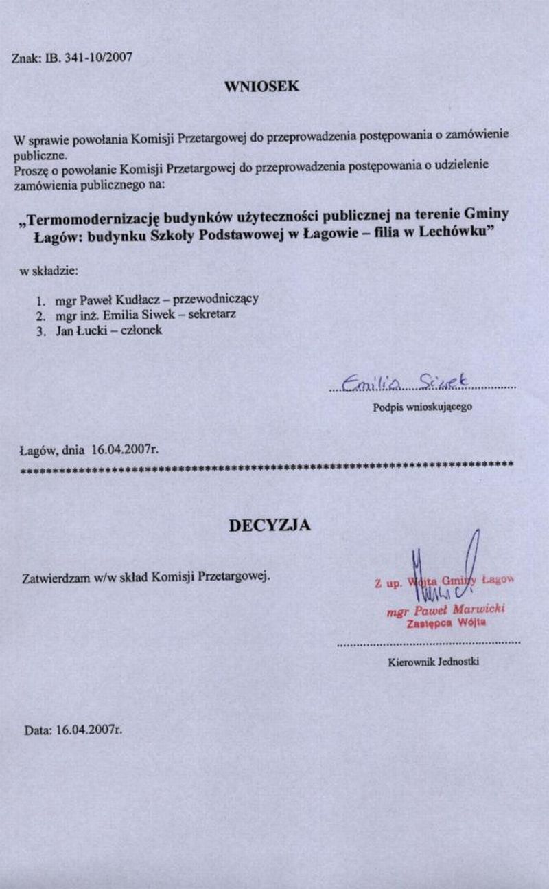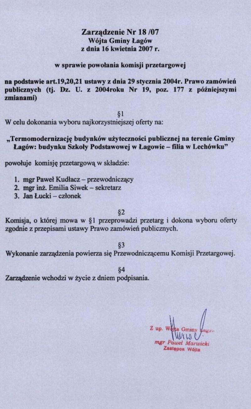 | Zarządzenie nr 18/07 Wójta Gminy Łagów z dn. 16 kwietnia 2007 r. w sprawie powołania komisji przetargowej. | 2008-08-25 |