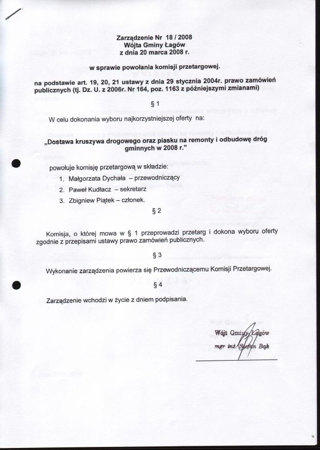 | Zarządzenie nr 18/2008 Wójta Gminy Łagów z dn. 20 marca 2008 r. w sprawie powołania komisji przetargowej. | 2008-08-23 |