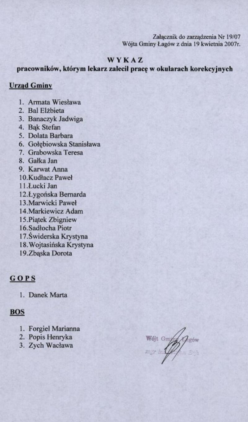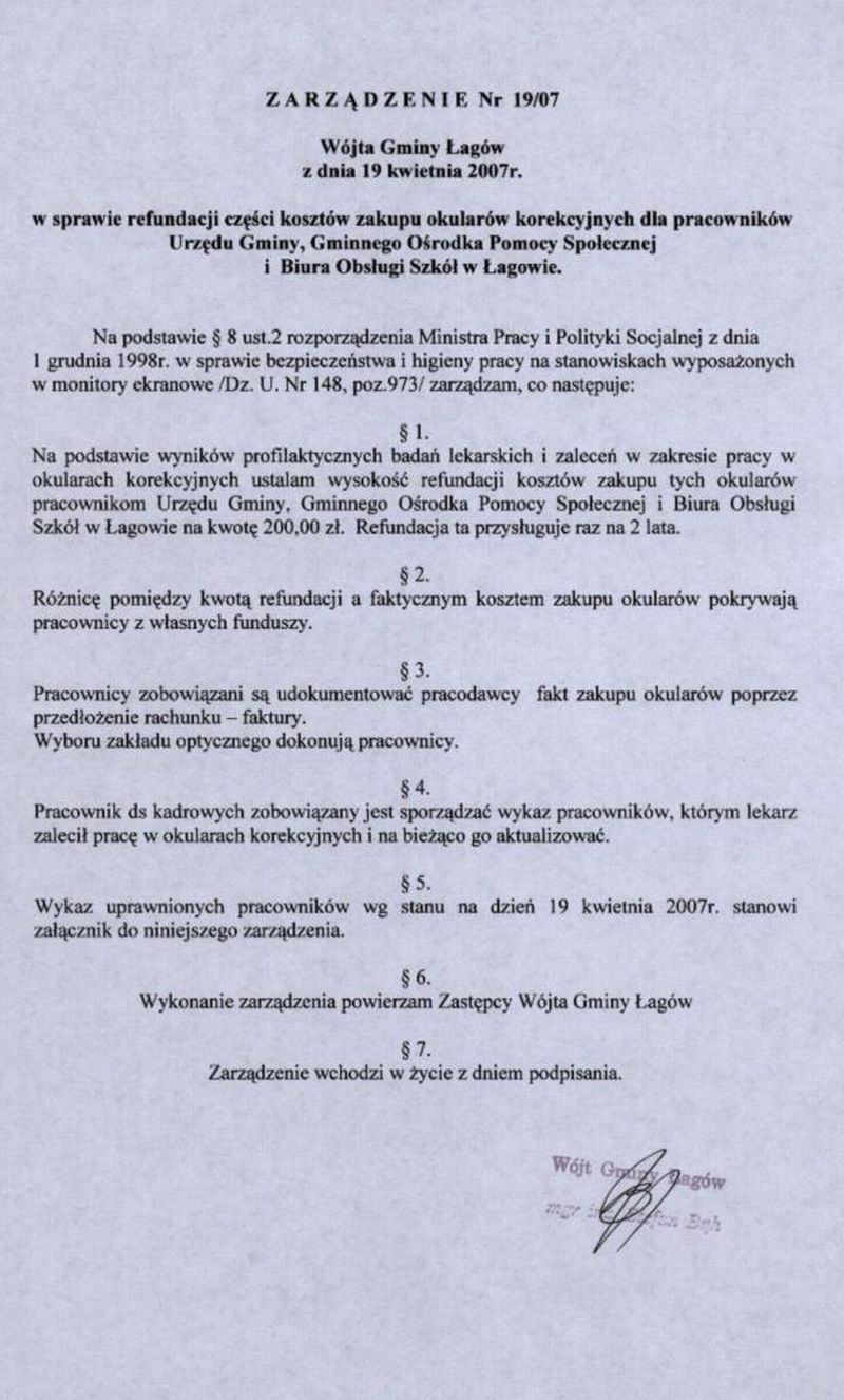 | Zarządzenie nr 19/07 Wójta Gminy Łagów z dn. 19 kwietnia 2007 r. w sprawie refundacji cześci kosztów zakupu okularów korekcyjnych dla pracowników ... | 2008-08-25 |