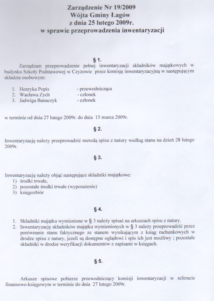 | Zarządzenie nr 19/09 Wójta Gminy Łagów z dnia 25 lutego 2009 r. w sprawie przeprowadzenia inwentaryzacji | 2009-06-12 |