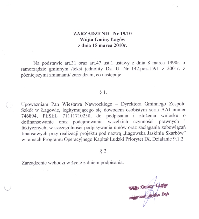 | Zarządzenie Nr 19/10 Wójt Gminy Łagów z dnia 15 marca 2010r. | 2010-05-14 |