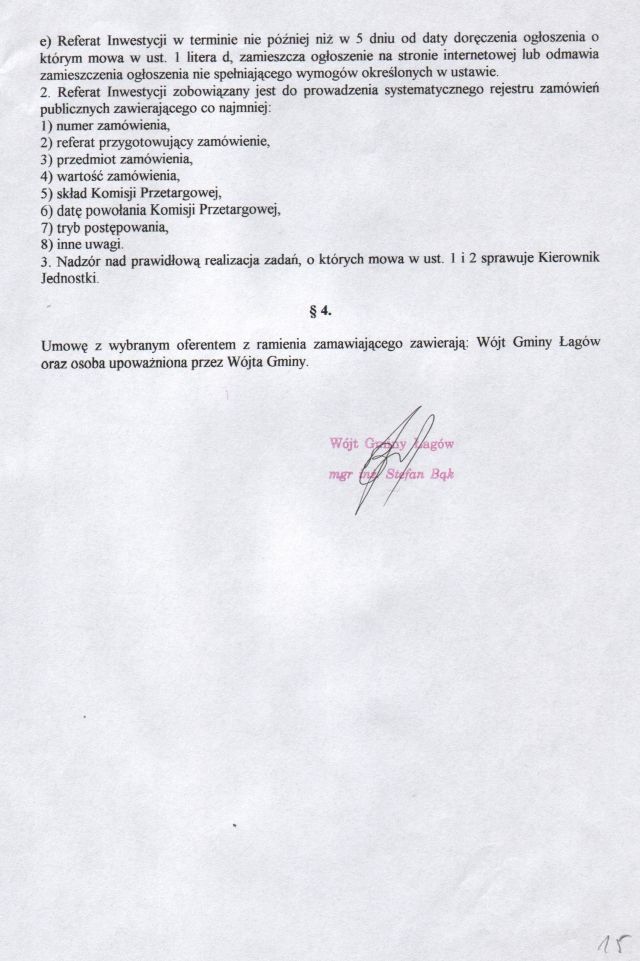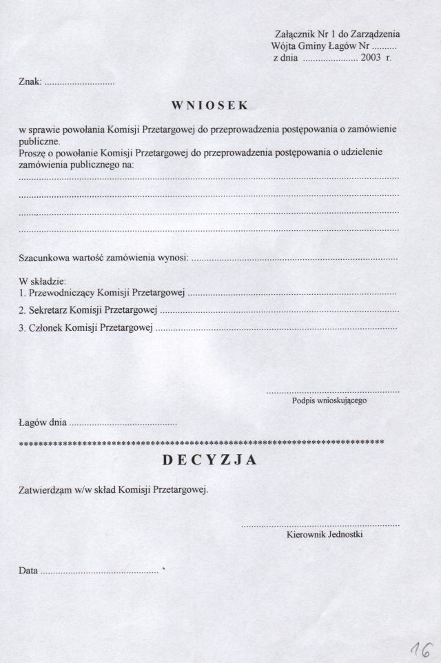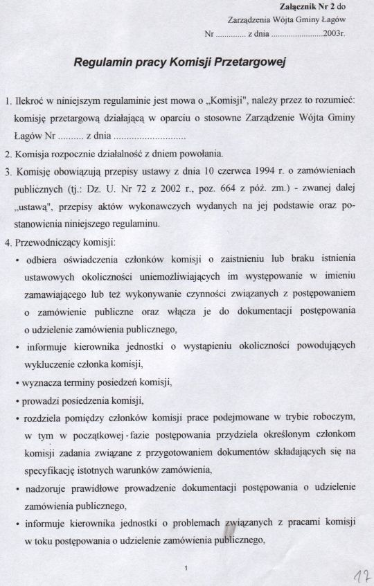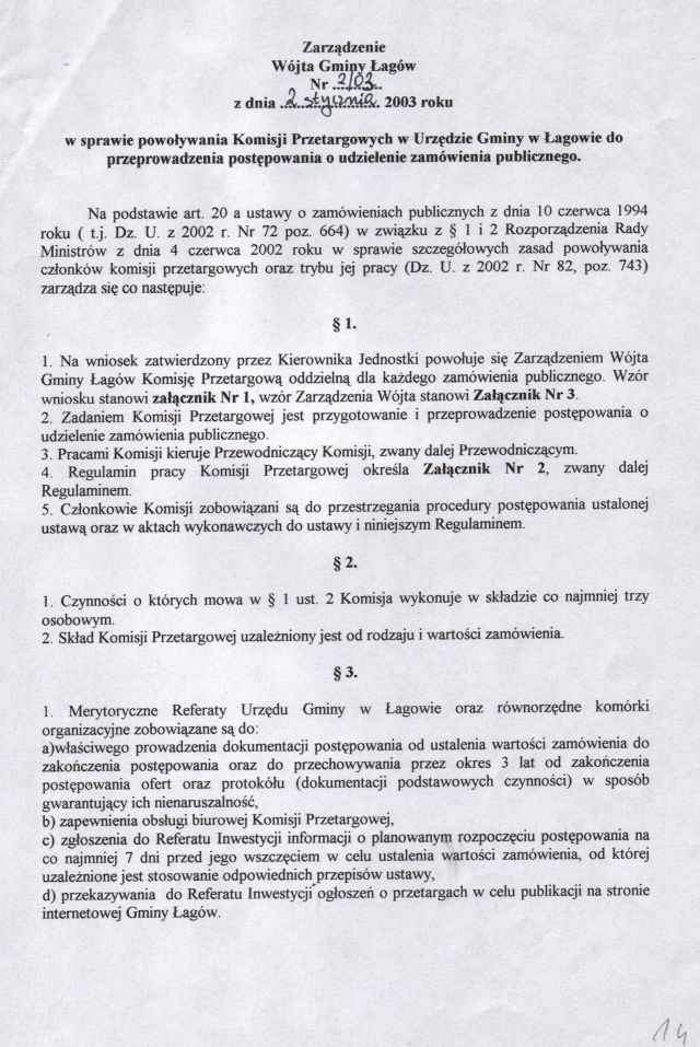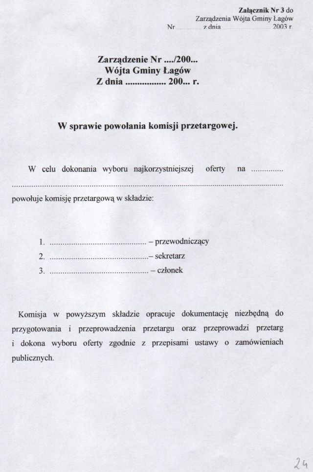 | Zarządzenie nr 2/03 Wójta Gminy Łagów z dn. 2 stycznia 2003 r. w sprawie powołania komisji przetargowej w Urzędzie Gminy w Łagowie do przeprowadzenia postępowania o udzielenie zamówienia publicznego. | 2008-10-23 |
