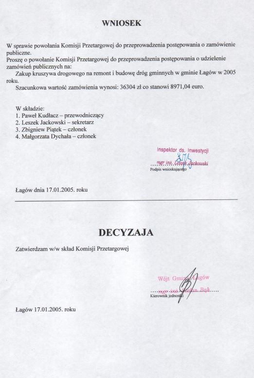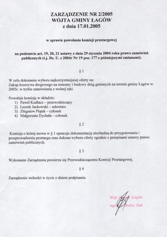 | Zarządzenie nr 2/05 Wójta Gminy Łagów z dn.17 stycznia 2005 r. w sprawie powołania komisji przetargowej | 2008-10-17 |