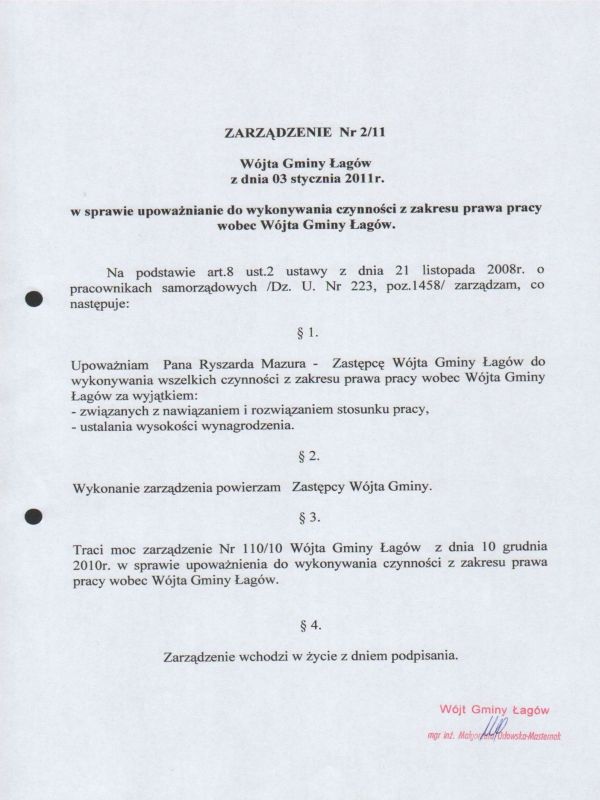| Zarządzenie Nr 2/11 Wójta Gminy Łagów z dnia 03 stycznia 2011 r. w sprawie upoważnienia do wykonywania czynności z zakresu prawa pracy wobec Wójta Gminy Łagów | 2011-02-02 |