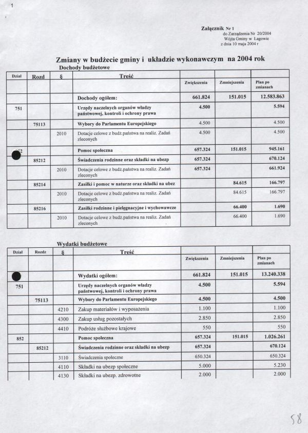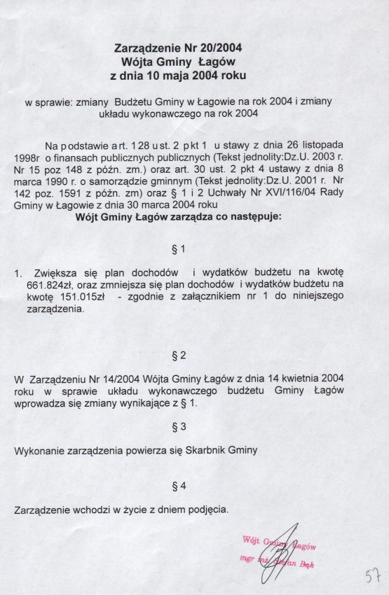 | Zarządzenie nr 20/04 Wójta Gminy Łagów z dn. 10 maja 2004 r. w sprawie: zmiany Budżetu Gminy w Łagowie na rok 2004 i zmiany układu wykonawczego na rok 2004. | 2008-10-22 |
