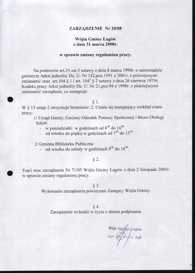 | Zarządzenie nr 20/08 Wójta Gminy Łagów z dn. 31 marca 2008 r. w sprawie zmiany regulaminu pracy. | 2008-08-23 |