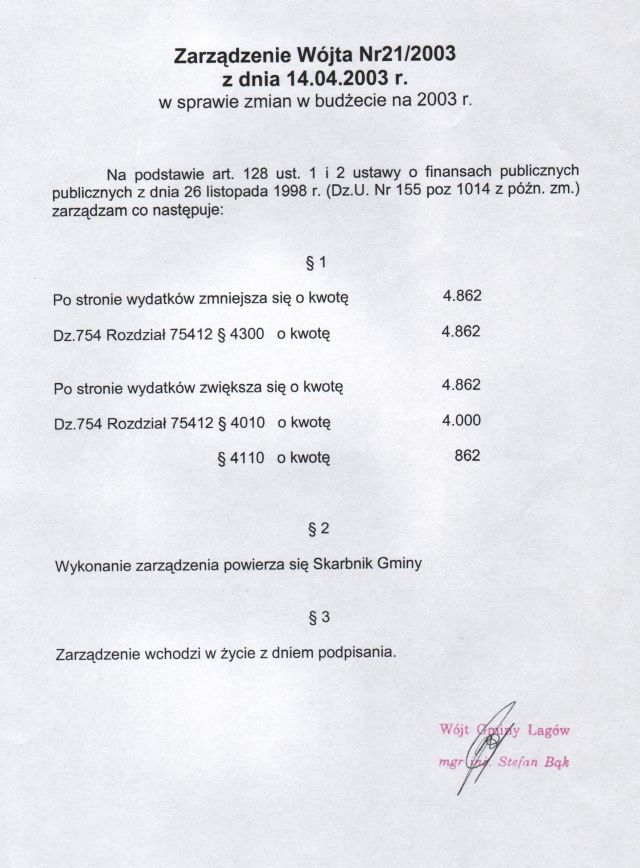 | Zarządzenie nr 21/03 Wójta Gminy Łagów z dn. 14 kwietnia 2003 r. w sprawie zmian w budżecie na 2003 r. | 2008-10-23 |