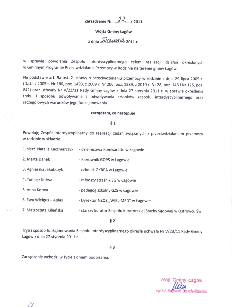 | Zarządzenie nr 22/2011 Wójta Gminy Łagów z dnia 22 marca 2011r. w sprawie powołania Zespołu Interdyscyplinarnego | 2011-05-17 |