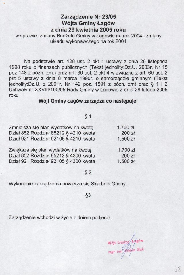 | Zarządzenie nr 23/05 Wójta Gminy Łagów z dn. 29 kwietnia 2005 r.w sprawie zmiany budżetu gminy w Łagowie na rok 2005 i zmiany układu wykonawczego na rok 2005. | 2008-10-17 |