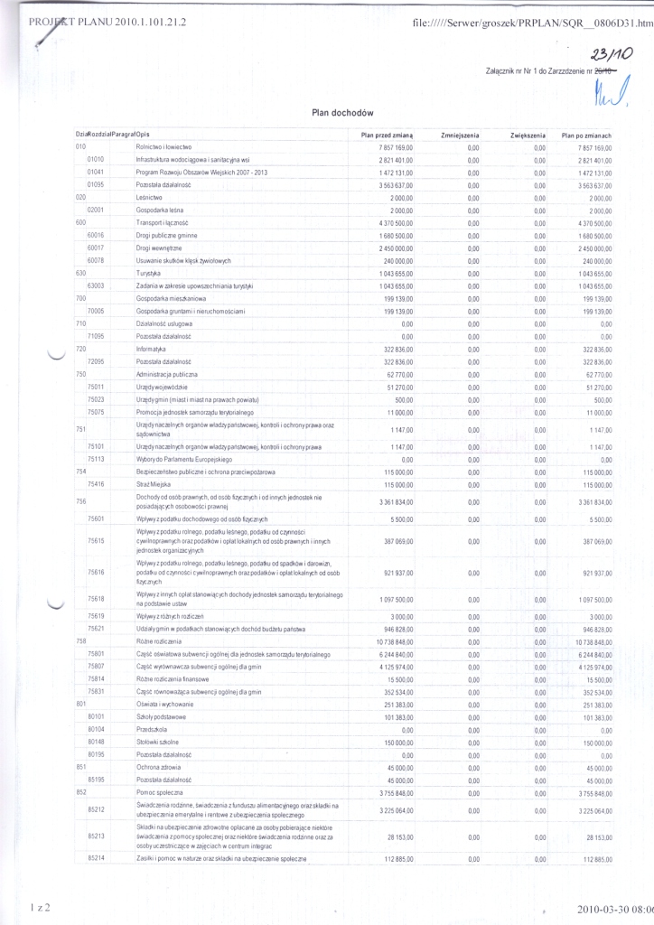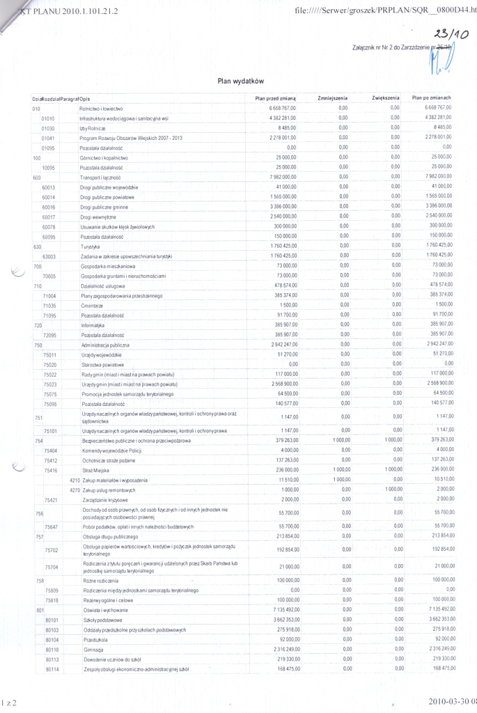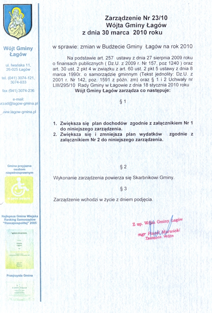 | Zarządzenie Nr 23/10 Wójta Gminy Łagów z dnia 30 marca 2010 roku w sprawie: zmian w Budżecie Gminy Łagów na rok 2010 | 2010-05-14 |
