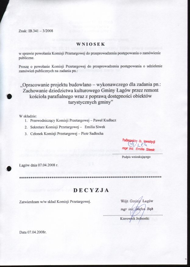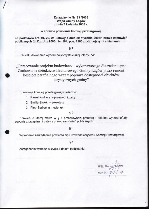 | Zarządzenie nr 23/2008 Wójta Gminy Łagów z dn. 7 kwietnia 2008 r. w sprawie powołania komisji przetargowej. | 2008-08-23 |