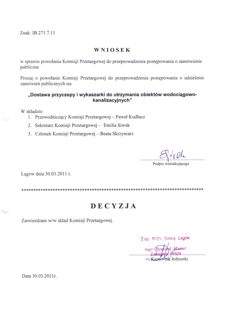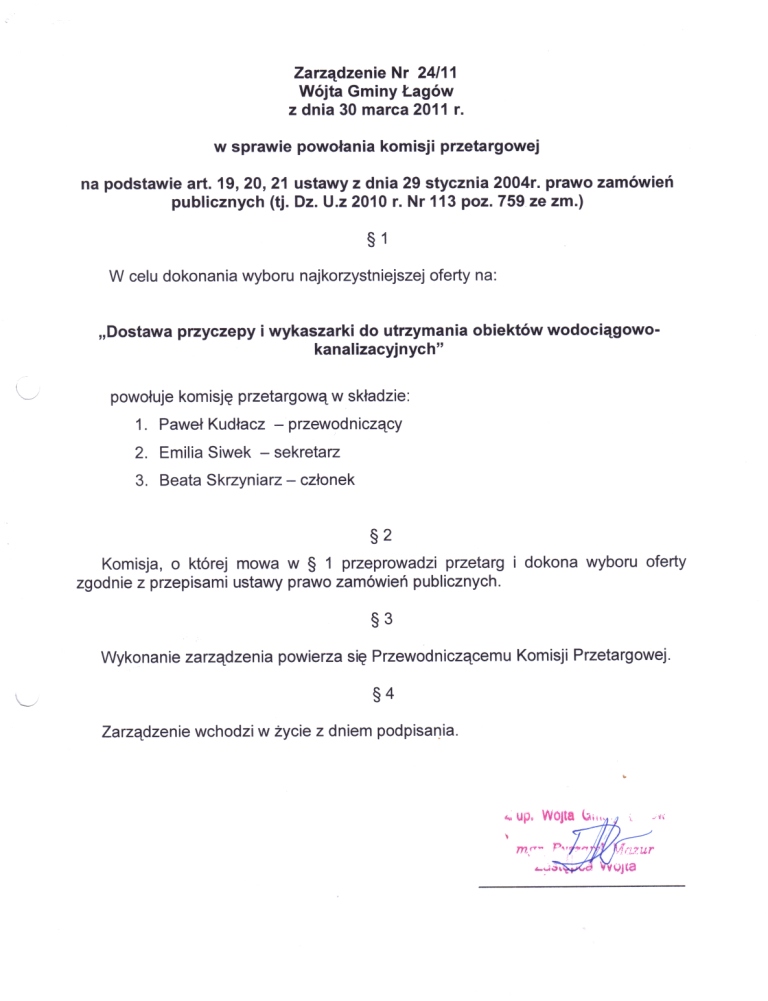 | Zarządzenie nr 24/2011 Wójta Gminy Łagów z dnia 30 marca 2011r. w sprawie powołania komisji przetargowej. | 2011-05-17 |