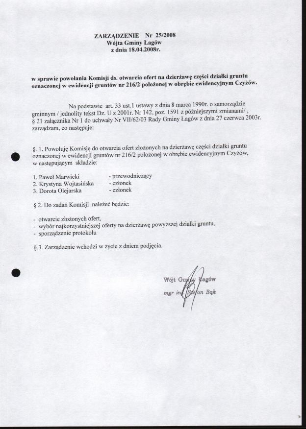 | Zarządzenie nr 25/08 Wójta Gminy Łagów z dn. 18.04.08 r. w sprawie powołania Komisji ds. otwarcia ofert na dzierżawę części działki 216/2 w Czyżowie. | 2008-08-25 |