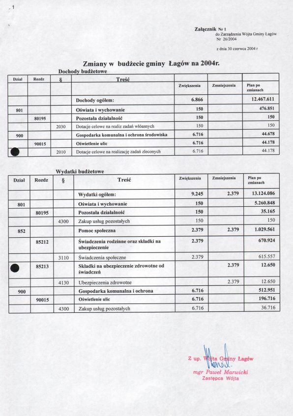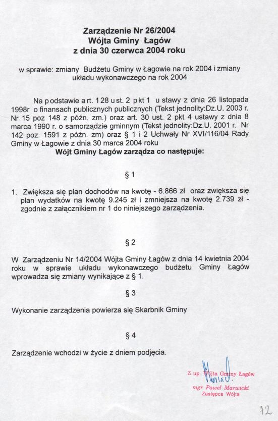 | Zarządzenie nr 26/04 Wójta Gminy Łagów z dn. 30 czerwca 2004 r. w sprawie: zmiany Budżetu Gminy w Łagowie na rok 2004 i zmiany Układu wykonawczego na rok 2004. | 2008-10-22 |