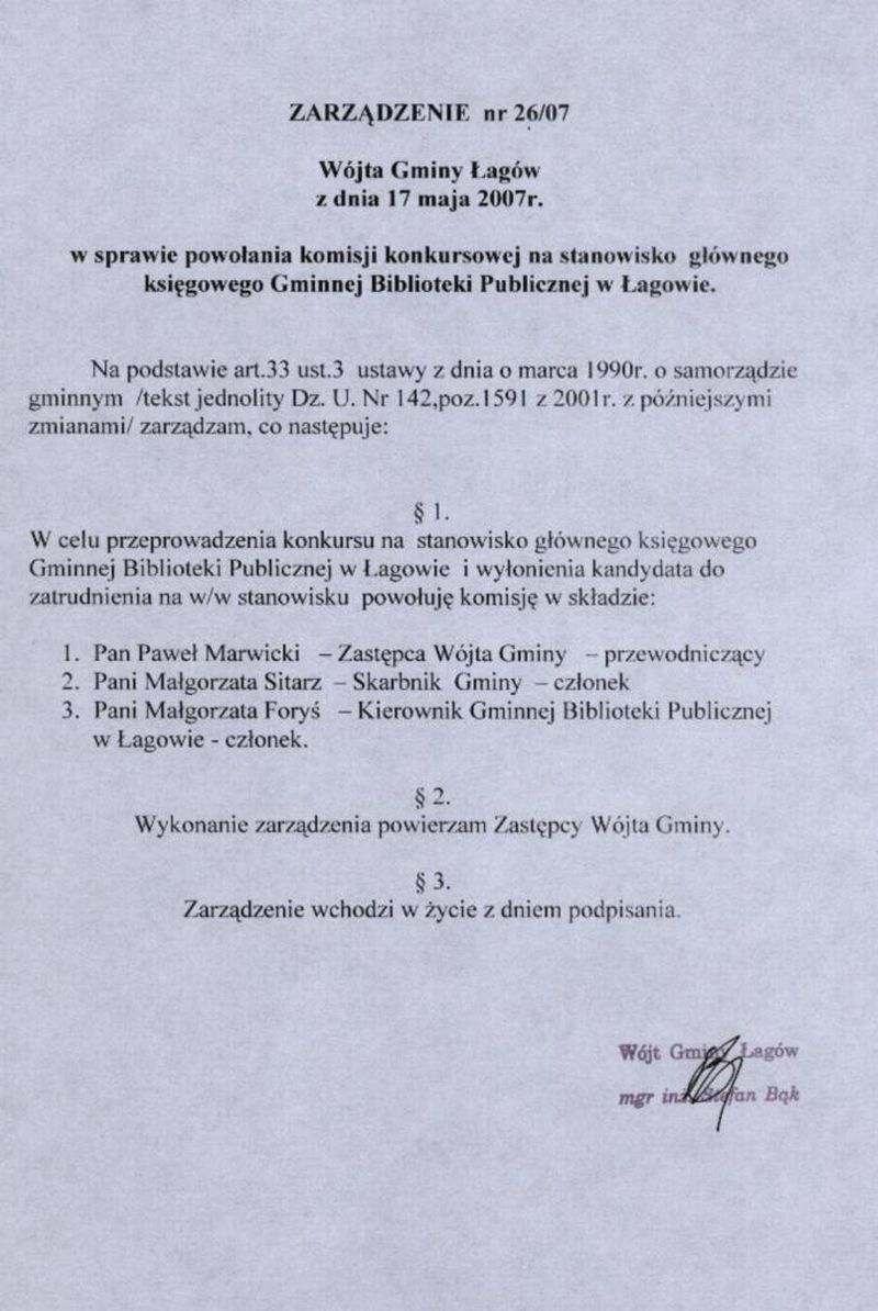 | Zarządzenie nr 26/07 Wójta Gminy Łagów z dn. 17 maja 2007 r. w sprawie powołania komisji konkursowej na stanowisko głównego ksiegowego Gminnej Biblioteki Publicznej w Łagowie. | 2008-08-25 |