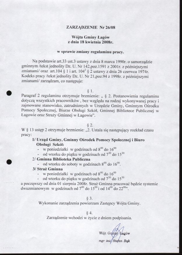 | Zarządzenie nr 26/08 Wójta Gminy Łagów z dn. 18 kwietnia 2008 r. w sprawie zmiany regulaminu pracy. | 2008-08-25 |