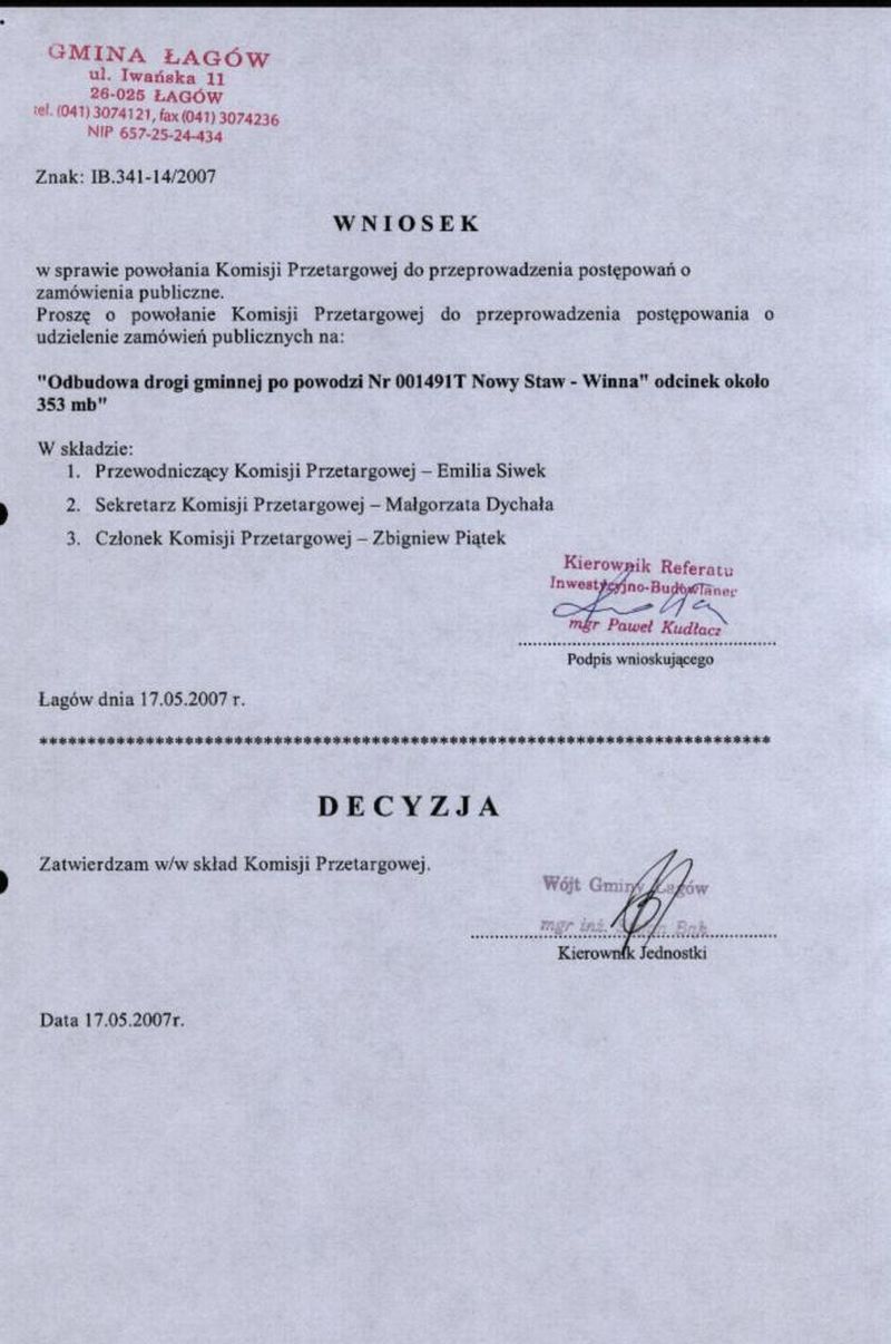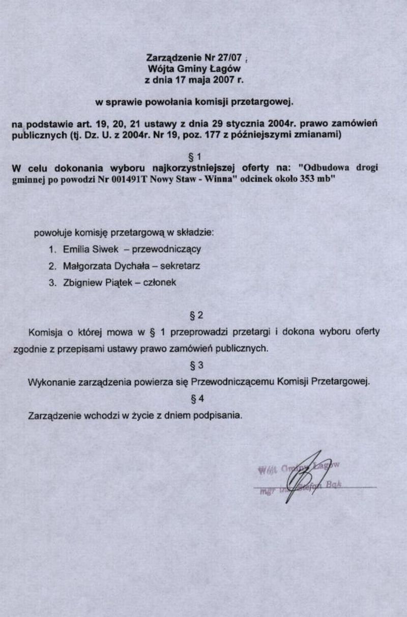 | Zarządzenie nr 27/07 Wójta Gminy Łagów z dn. 17 miaja 2007 r. w sprawie powołania komisji przetargowej. | 2008-08-25 |
