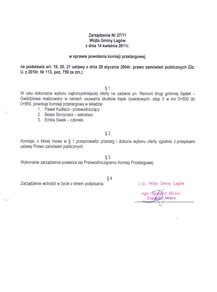 | Zarządzenie nr 27/2011 Wójta Gminy Łagów z dnia 14 kwietnia 2011r. w sprawie powołania komisji przetargowej. | 2011-05-17 |