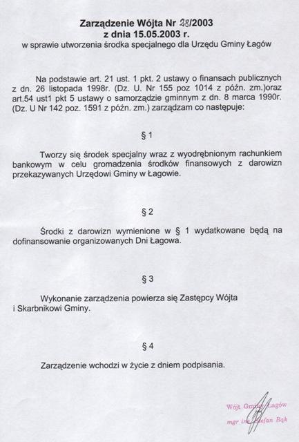 | Zarządzenie nr 28/03 Wójta Gminy Łagów z dn. 15 maja 2003 r. w sprawie utworzenia środka specjalnego dla Urzędu Gminy Łagów. | 2008-10-23 |