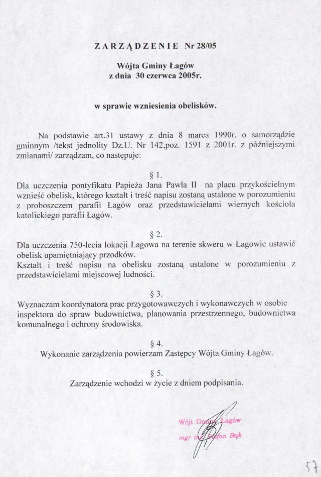 | Zarządzenie nr 28/05 Wójta Gminy Łagów z dn. 30 czerwca 2005 r. w sprawie wzniesienia obelisków. | 2008-10-17 |