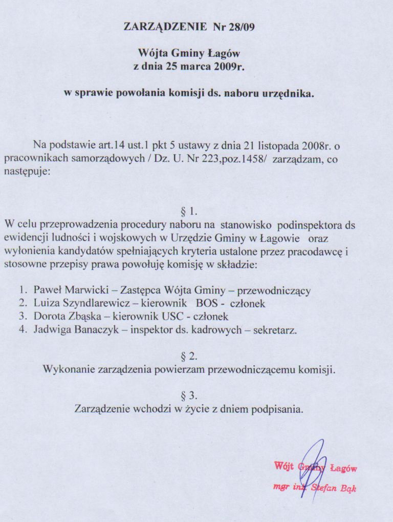 | Zarządzenie nr 28/09 Wójta Gminy Łagów z dnia 25 marca 2009 r. w sprawie powołania komisji ds. naboru urzędnika | 2009-06-12 |