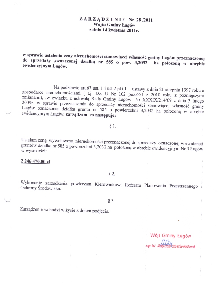 | Zarządzenie nr 28/2011 Wójta Gminy Łagów z dnia 14 kwietnia 2011r. w sprawie ustalenia ceny nieruchomości stanowiącej własność Gminy Łagów. | 2011-05-17 |