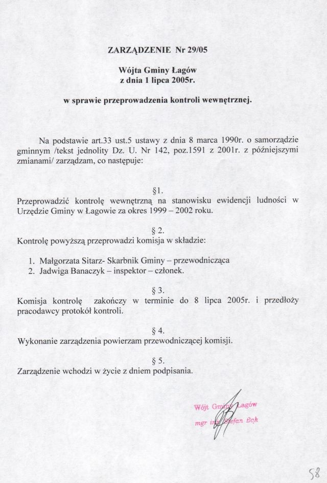 | Zarządzenie nr 29/05 Wójta Gminy Łagów z dn. 1 lipca 2005 r. w sprawie przeprowadzenia kontroli wewnętrznej. | 2008-10-17 |