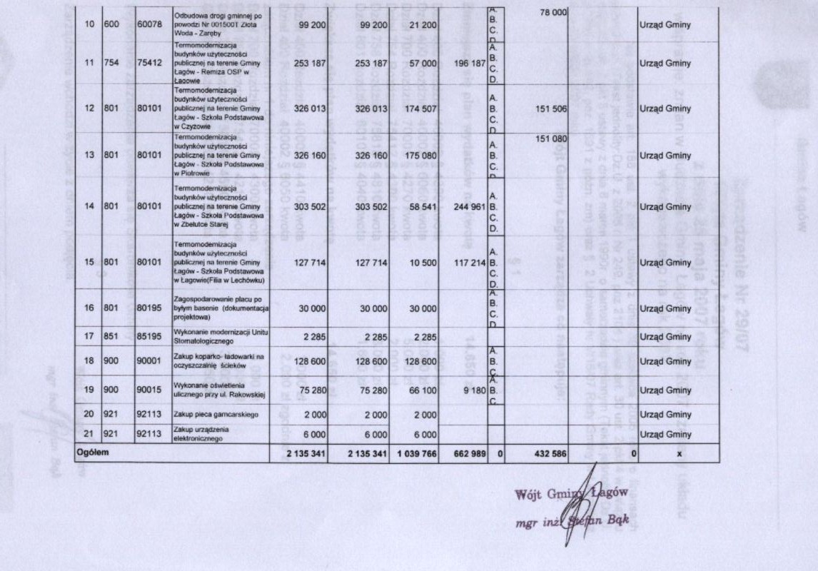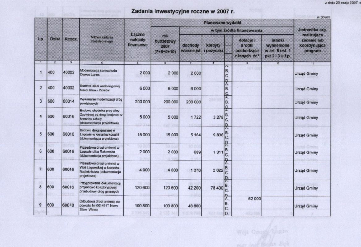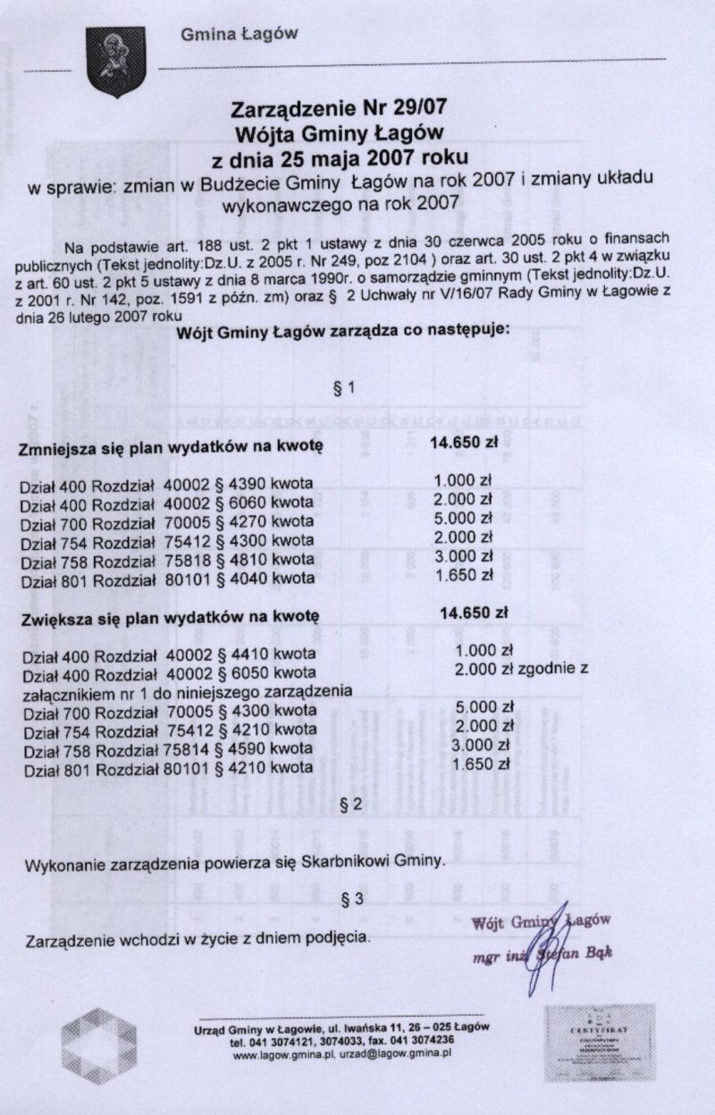 | Zarządzenie nr 29/07 Wójta Gminy Łagów z dn. 25 maja 2007 roku w sprawie zmian w Budżecie Gminy Łagów na rok 2007 i zmiany układu wykonawczego na rak 2007. | 2008-08-25 |