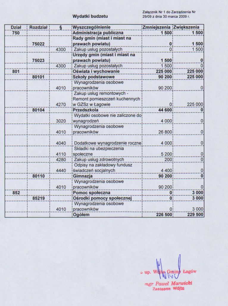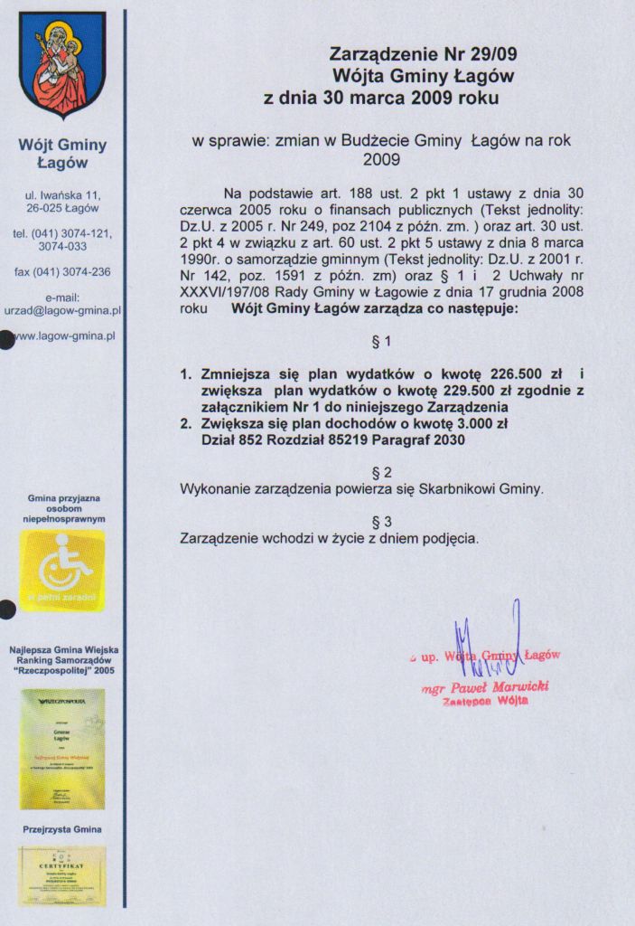 | Zarządzenie nr 29/09 Wójta Gminy Łagów z dnia 30 marca 2009 r. w sprawie zmian w Budżecie Gminy Łagów na rok 2009 | 2009-06-12 |
