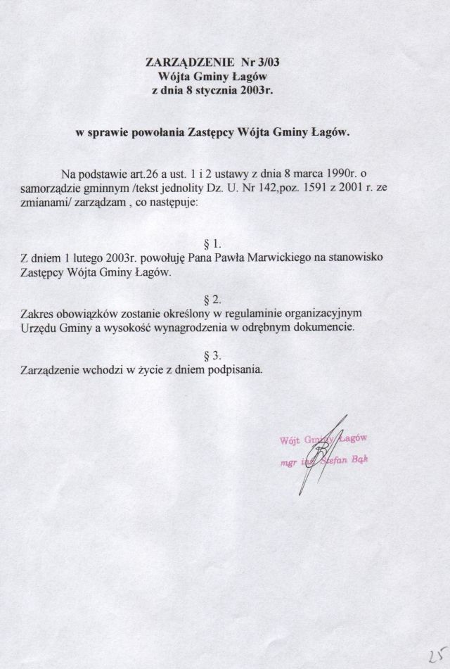 | Zarządzenie nr 3/03 Wójta Gminy Łagów z dn. 8 stycznia 2003 r. w sprawie powołania Zastępcy Wójta Gminy Łagów. | 2008-10-23 |