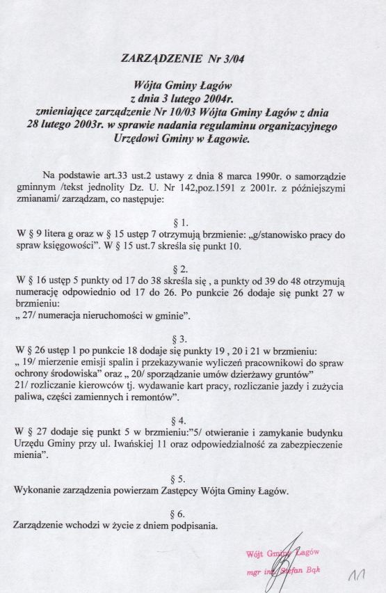 | Zarządzenie nr 3/04 Wójta Gminy Łagów z dn. 3 lutego 2004 r. zmieniające zarządzenie Nr 10/03. | 2008-10-22 |