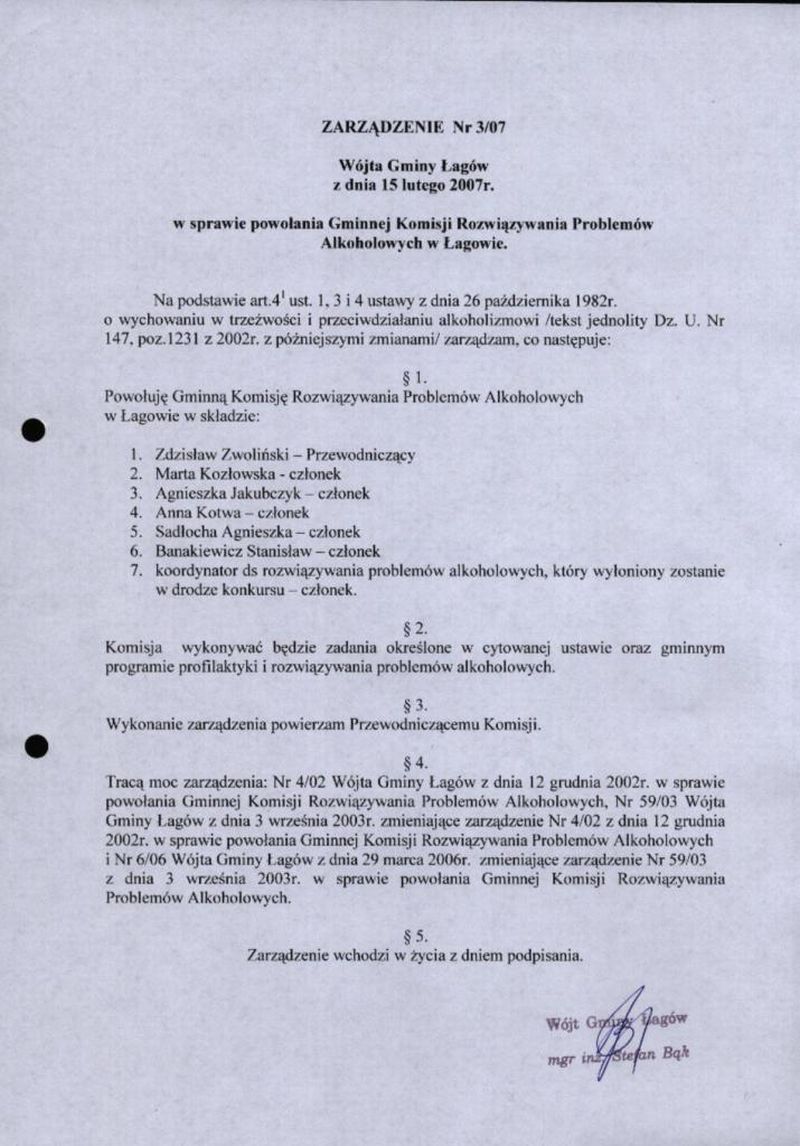 | Zarządzenie nr 3/07 Wójta Gminy Łagów z dn. 15 lutego 2007 r. w sprawie powołania Gminnej Komisji Rozwiązywania Problemów Alkoholowych w Łagowie. | 2008-08-25 |