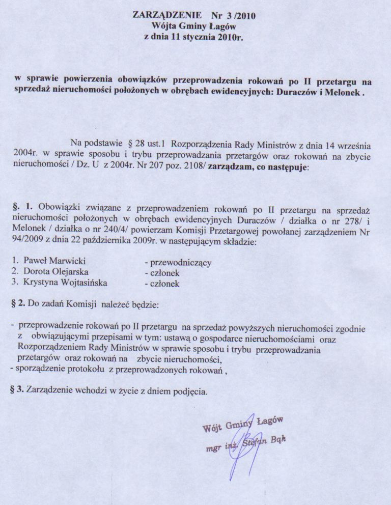 | Zarządzenie nr 3/2010 Wójta Gminy Łagów z dnia 11 stycznia 2010 r. w sprawie powierzenia obowiązków przeprowadzenia rokowań po II przetargu na sprzedaż nieruchomości położonych w obrębach ewidencyjnych: Duraczów i Melonek | 2010-02-09 |