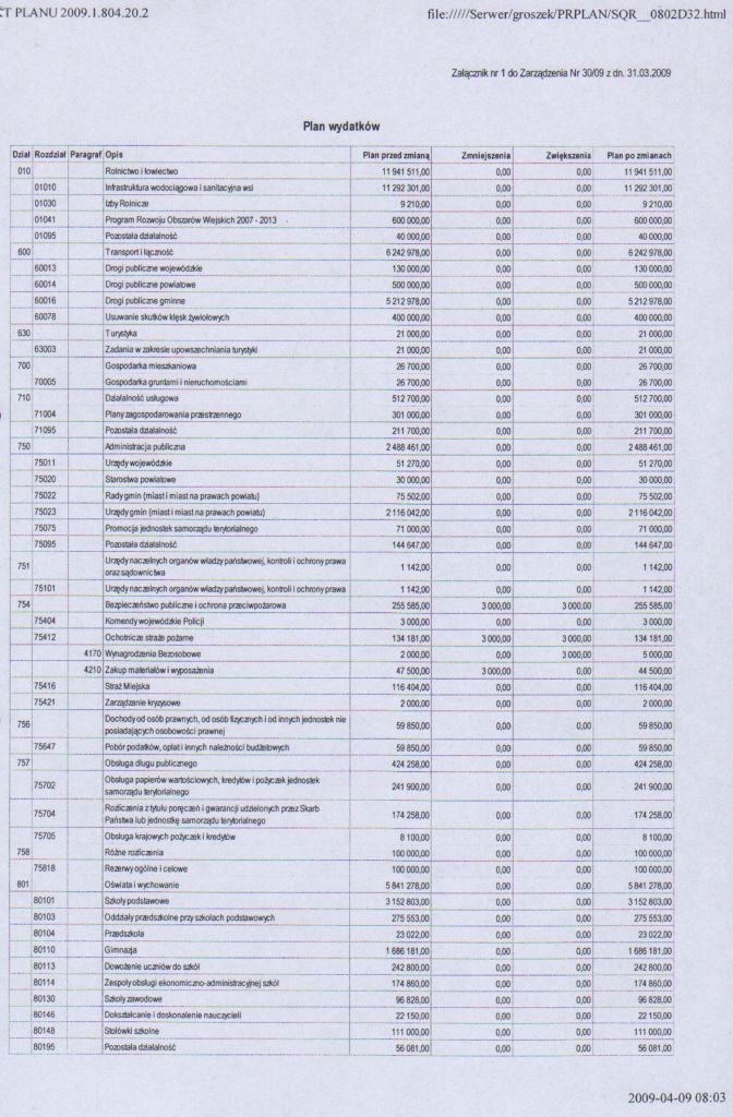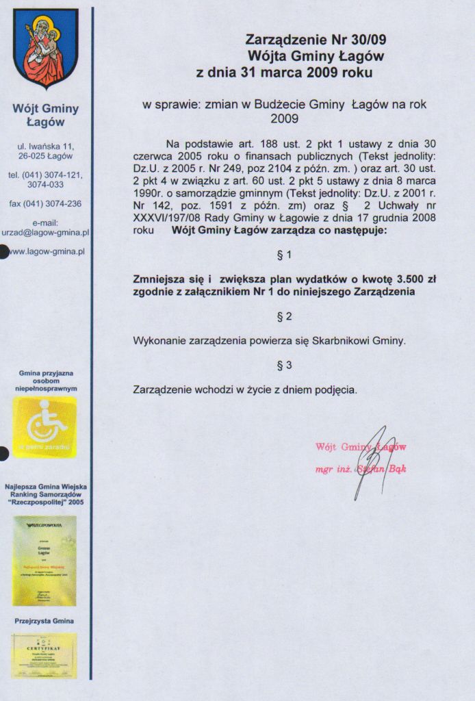 | Zarządzenie nr 30/09 Wójta Gminy Łagó z dnia 31 marca w sprawie zmian w budżecie gminy Łagów na rok 2009 | 2009-06-12 |