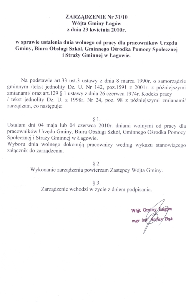 | Zarządzenie Nr 31/10 Wójta Gminy Łagów z dnia 23 kwietnia 2010r. w sprawie ustalenia dnia wolnego od pracy dla pracowników Urzędu Gminy, Biura Obsługi Szkół, Gminnego Ośrodka Pomocy Społecznej i Straży Gminnej w Łagowie. | 2010-05-14 |