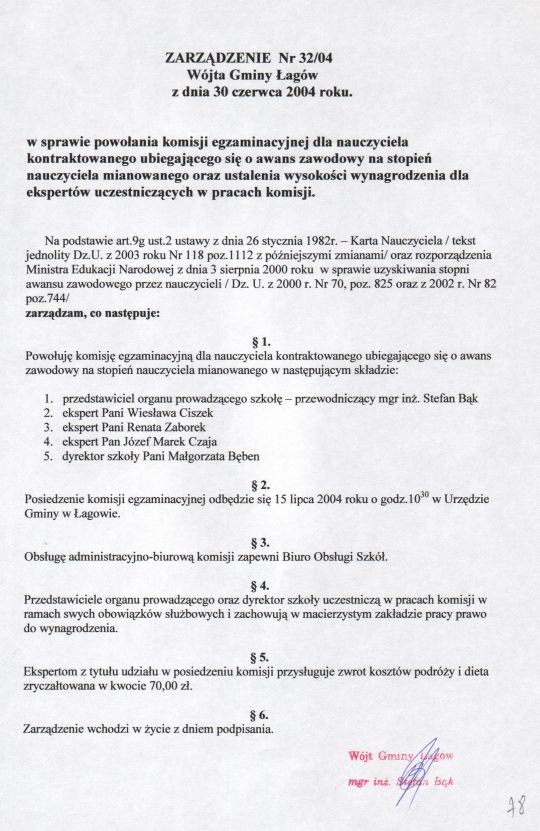 | Zarządzenie nr 32/04 Wójta Gminy Łagów z dn. 30 czerwca 2004 r. w sprawie powołania komisji egzaminacyjnej dla nauczyciela kontraktowanego ubiegającego się o awans zawodowy na stopień nauczyciela mianowanego. | 2008-10-22 |