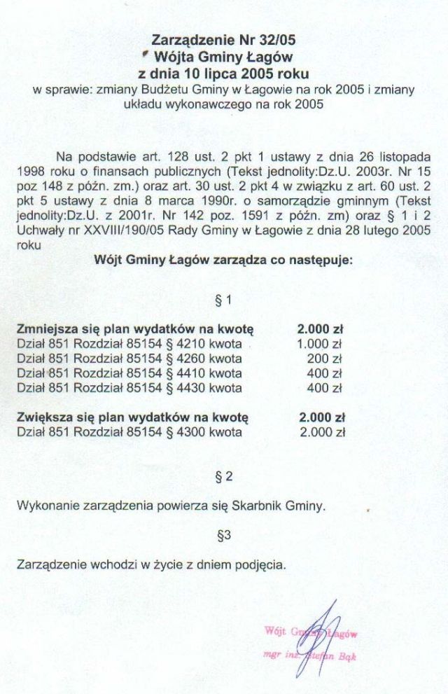 | Zarządzenie nr 32/05 Wójta Gminy Łagów z dn. 10 lipca 2005 r. w sprawie zmiany Budżetu Gminy w Łagowie na rok 2005 i zmiany układu wykonawczwego na rok 2005. | 2008-10-17 |