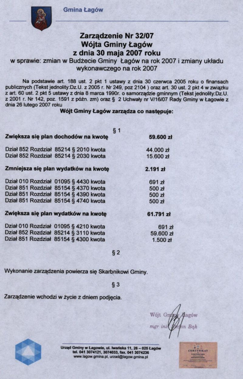 | Zarządzenie nr 32/07 Wójta Gminy Łagów z dn. 30 maja 2007 r. w sprawie zmian w Budżecie Gminy Łagów na rok 2007 i zmiany układu wykonawczego na rok 2007. | 2008-08-25 |