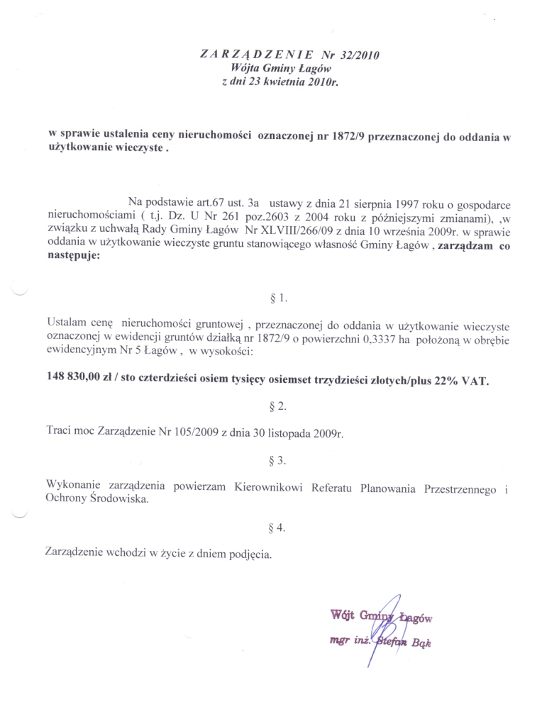 | Zarządzenie Nr 32/2010 Wójta Gminy Łagów z dnia 23 kwietnia 2010r. w sprawie ustalenia ceny nieruchomości oznaczonej nr 1872/9 przeznaczonej do oddania w użytkowanie wieczyste. | 2010-05-14 |