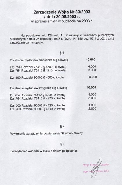 | Zarządzenie nr 33/03 Wójta Gminy Łagów z dn. 20 maja 2003 r. w sprawie zmian w budżecie na 2003r. | 2008-10-23 |