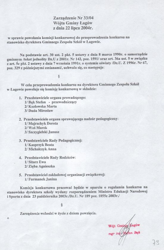 | Zarządzenie nr 33/04 Wójta Gminy Łagów z dn. 22 lipca 2004 r. w sprawie powołania komisji konkursowej do przeprowadzenia konkursu na stanowisko dyrektora Gminnego Zespołu Szkól w Łagowie. | 2008-10-22 |