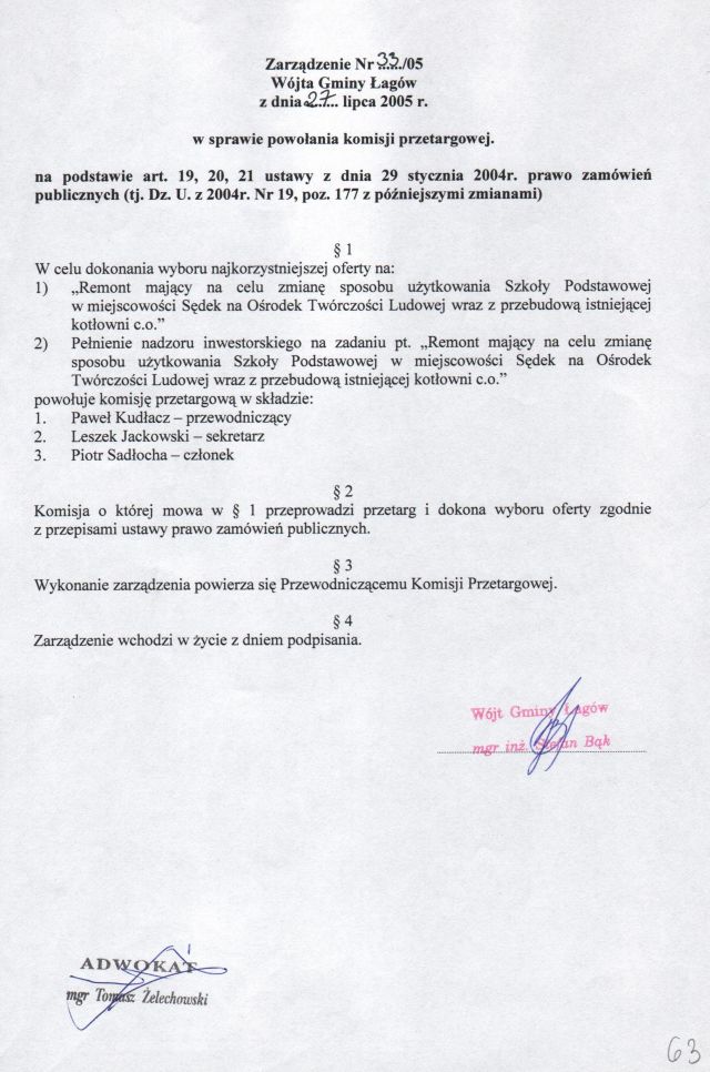 | Zarządzenie nr 33/05 Wójta Gminy Łagów z dn. 27 lipca 2005 r. w sprawie powołania komisji przetargowej. | 2008-10-17 |