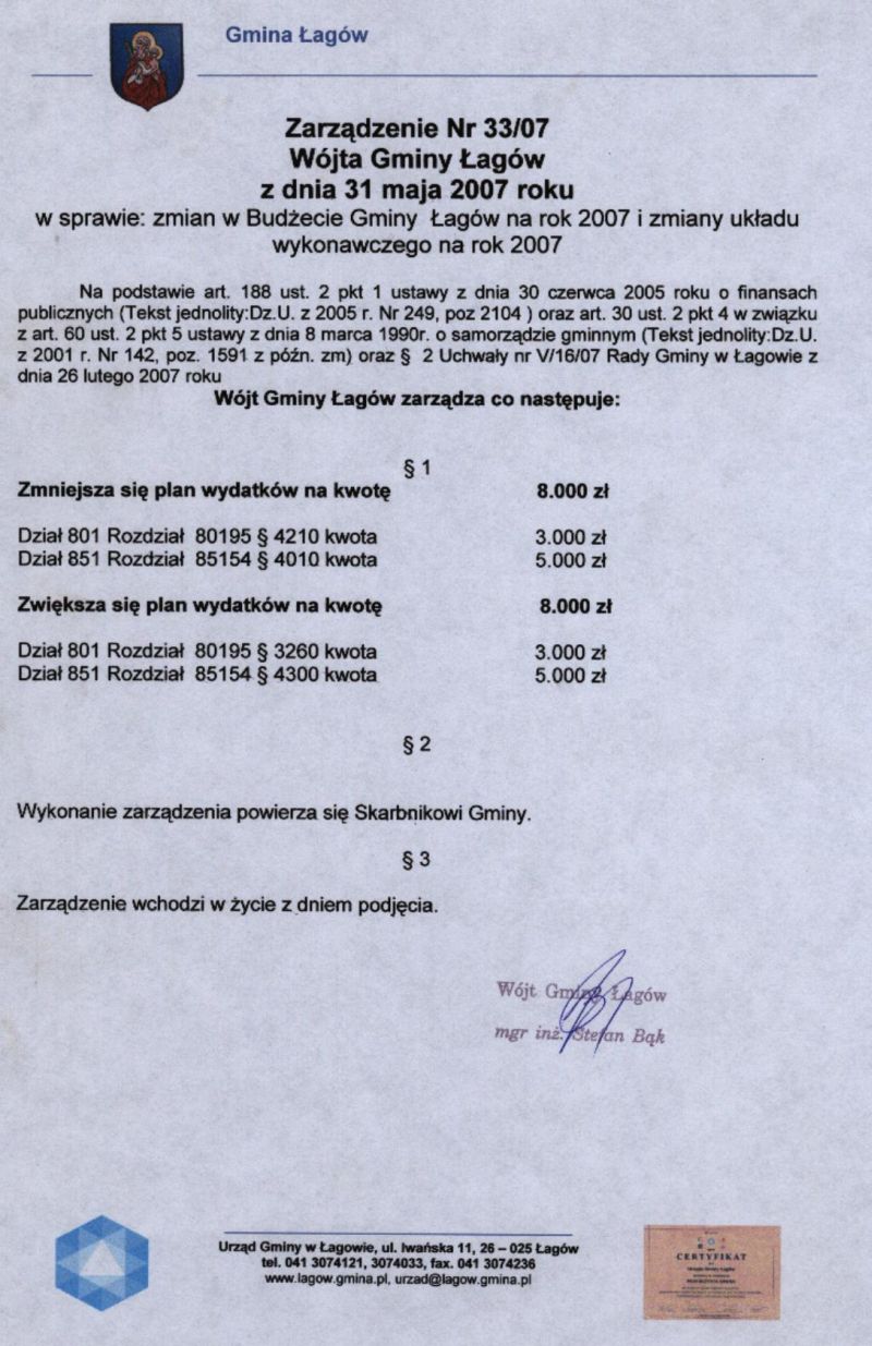 | Zarządzenie nr 33/07 Wójta Gminy Łagów z dn. 31 maja 2007 r. w sprawie zmiany w Budżecie Gminy Łagów na rok 2007 i zmiany układu wykonawczego na rok 2007. | 2008-08-25 |