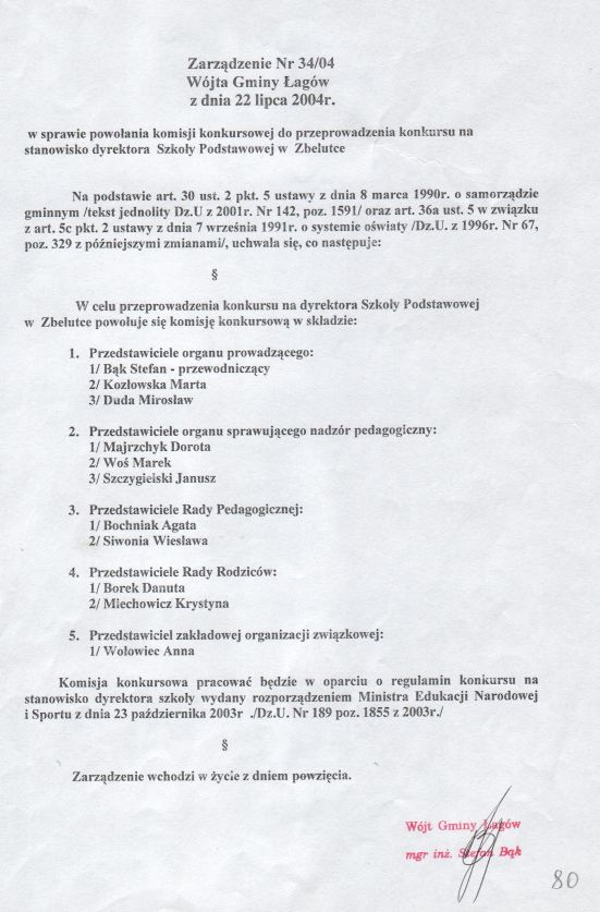 | Zarządzenie nr 34/04 Wójta Gminy Łagów z dn. 22 lipca 2004 r. w sprawie powołania komisji konkursowej do przeprowadzenia konkursu na stanowisko dyrektora Szkoły Podstawowej w Zbelutce. | 2008-10-22 |
