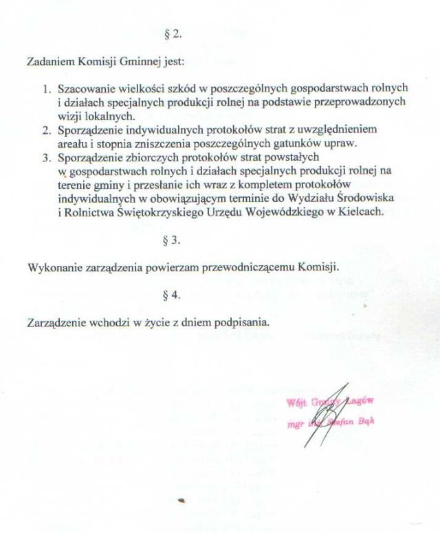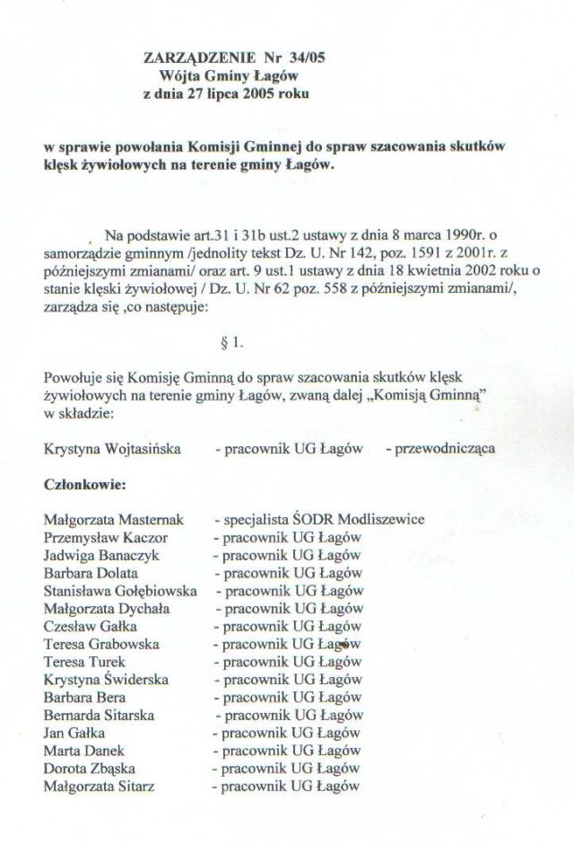 | Zarządzenie nr 34/05 Wójta Gminy Łagów z dn. 27 lipca 2005 r. w sprawie powołania Komisji Gminnej do spraw szacowania skutków klęsk żywiołowych na terenie gminy Łagów. | 2008-10-17 |