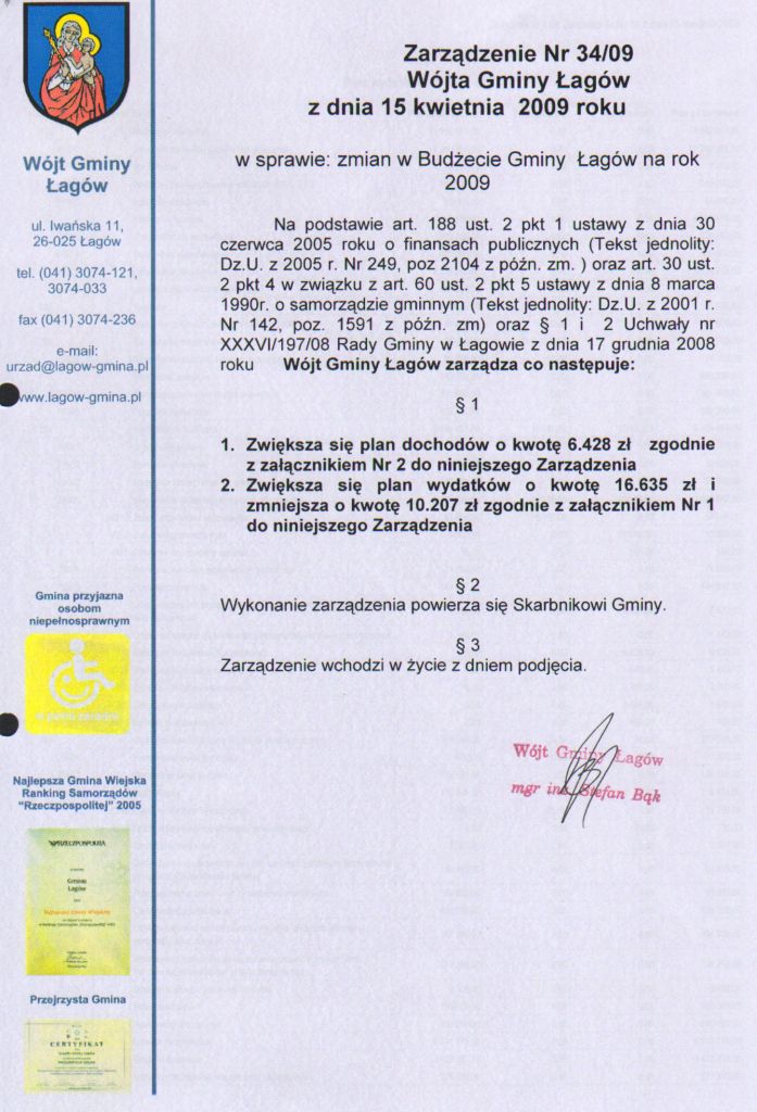 | Zarządzenie nr 34/09 Wójta Gminy Łagów z dnia 15 kwietnia 2009 r. w sprawie zmian w budżecie Gminy Łagów na rok 2009 | 2009-06-12 |