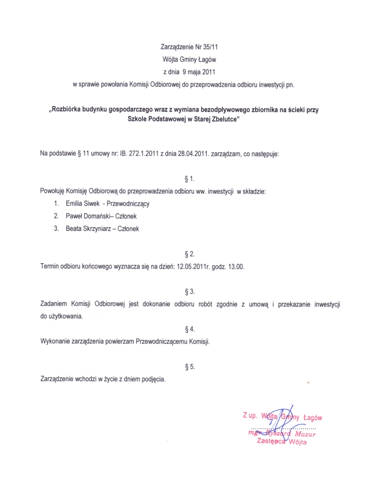 | Zarządzenie nr 35/2011 Wójta Gminy Łagów z dnia 9 maja 2011r. w sprawie powołania Komisji Odbiorowej. | 2011-05-17 |