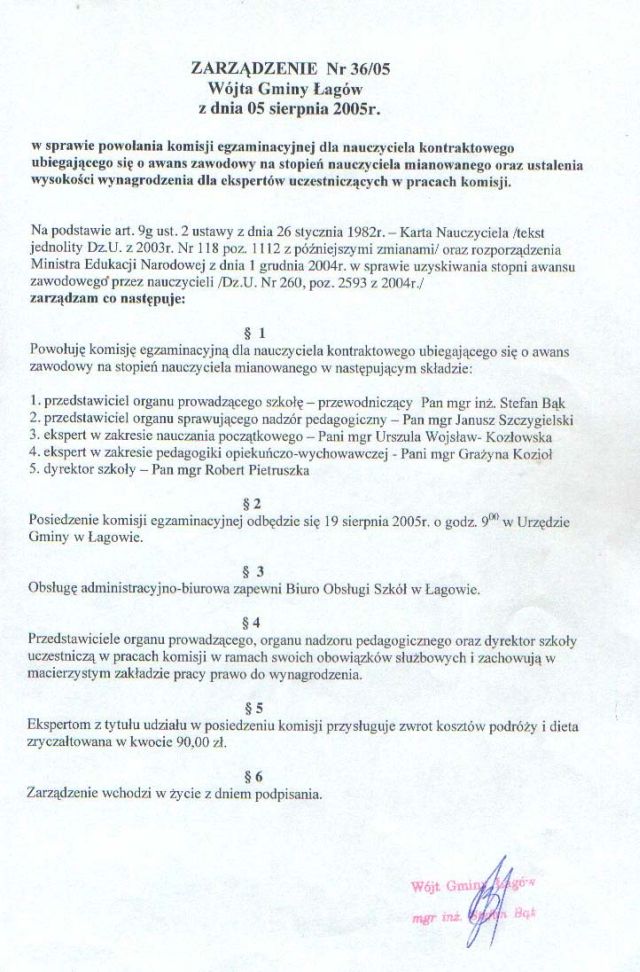 | Zarządzenie nr 36/05 Wójta Gminy Łagów z dn. 5 sierpnia 2005 r. w sprawie powołania komisji egzaminacyjnej dla nauczyciela kontraktowego ubiegającego sie o awans zawodowy. | 2008-10-17 |