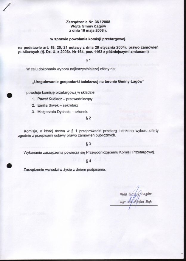 | Zarządzenie nr 36/08 Wójta Gminy Łagów z dn. 16 maja 2008 r. w sprawie powołania komisji przetargowej. | 2008-08-25 |